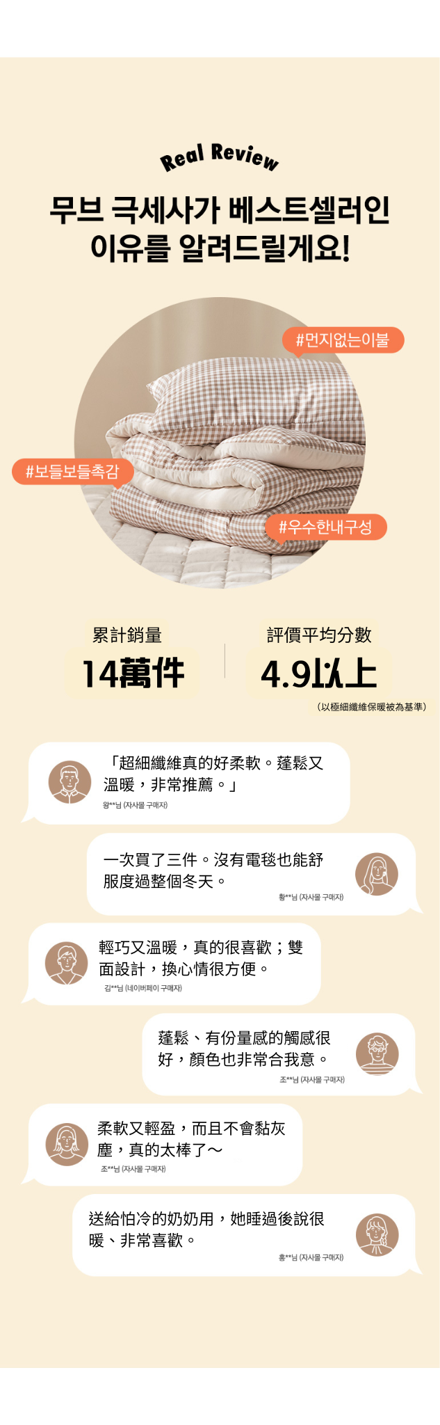 全部皆使用品質明顯更佳的「韓國本土生產極細纖維」。